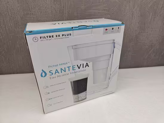 Article NEUF jamais servis ➡️(pr-801) Pichet avec Système de filtration d’eau + ajout minéraux, marque : Santevia, très belle qualité, matière plastique épais, Hauteur 26 cm x 13 cm, capacité 2 litres. 1 filtre fournis (blister intact), on trouve les filtres facilement sur le web. Fabriqué au Canada. Valeur sur le web 57€
