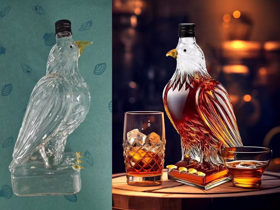➡️(pr-827) bouteilles en verre forme oiseau avec bouchon ouverture par vissage pour whisky ou autre alcool. Dimension hors tout (bec compris) Hauteur : 19 cm x 12 cm x 8 cm