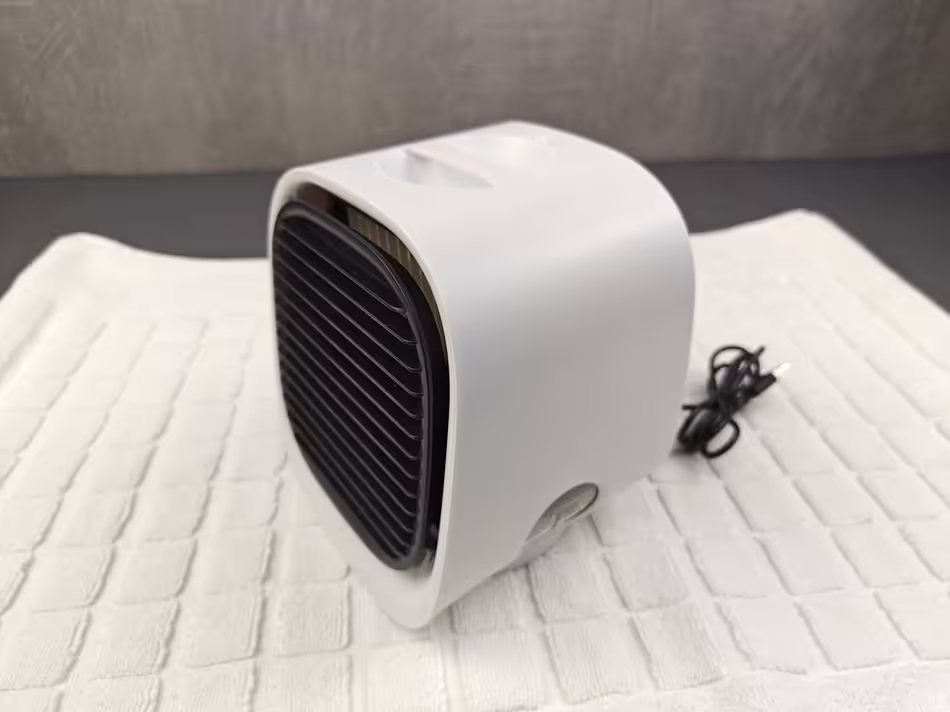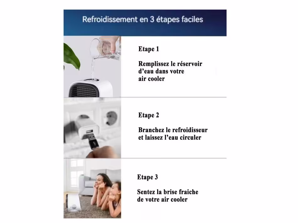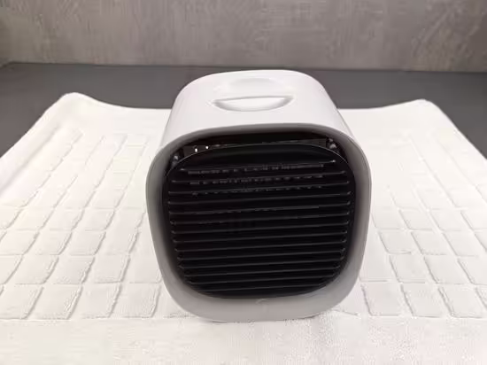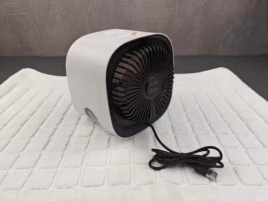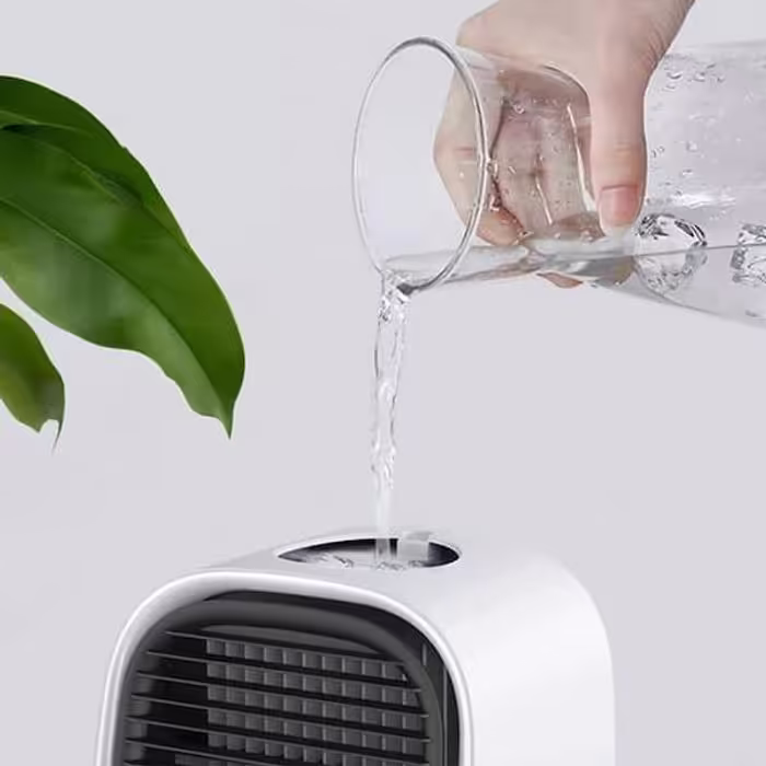 Article NEUF ➡️(pr-715) Mini rafraîchisseur d’air portable - air cooler, 3 vitesses de ventilation, remplir d’eau fraiche pour faire un mini climatiseur, grille avant orientable, branchement USB, adapteur secteur non fourni, dimension : Largeur 15 cm x Hauteur 17 cm x profondeur 15 cm.