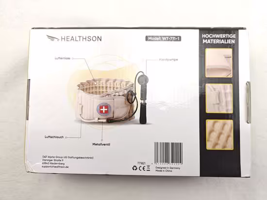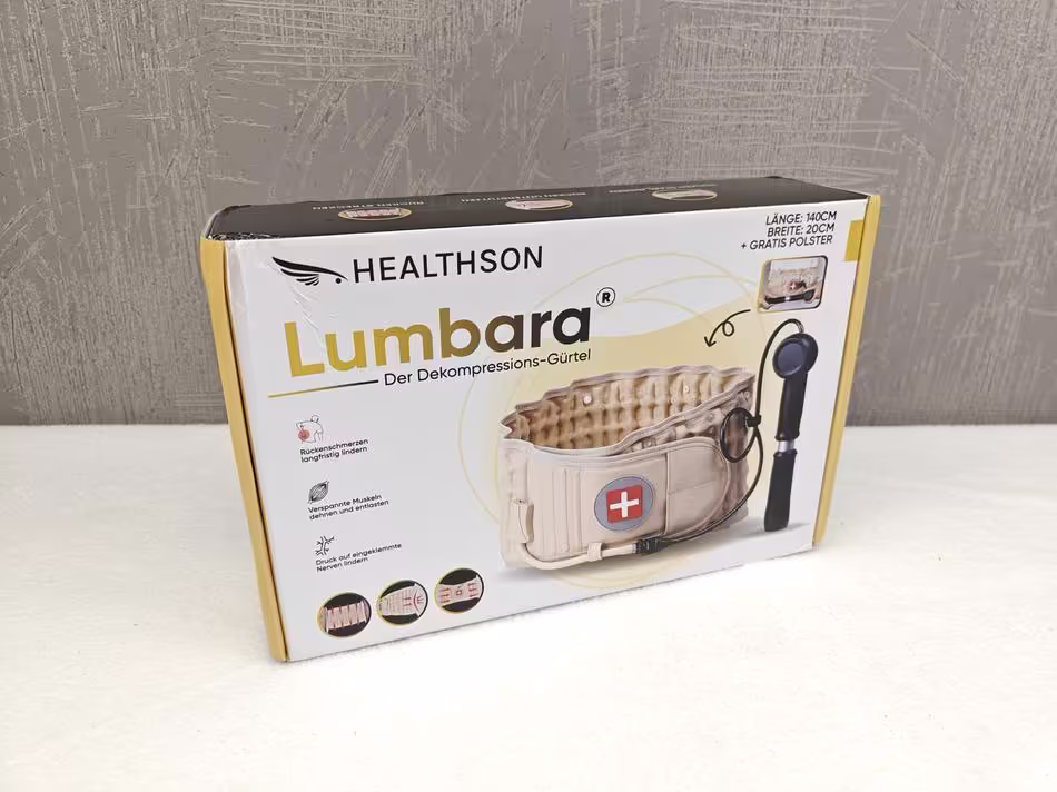 Article NEUF jamais servis ➡️(pr-795) Ceinture dorsale marque : HEALTHSON Lumbara®, Longueur 115 cm + une rallonge fourni, largeur 13 cm. Sa conception innovante avec élément gonflable s’adapte avec souplesse et assure un confort optimal à chaque mouvement. Respirante, contre les maux de dos, soutien lombaire, soulagement de la hernie discale et sciatique, bandage dorsal quotidien. Utilisation facile : équipée d’un système de pompe intuitif et de connexions Velcro sécurisées. Vendu 80€ sur le site du fabricant. Notice en allemand (facilement traduisible avec google traduction) - Valeur 80 €
