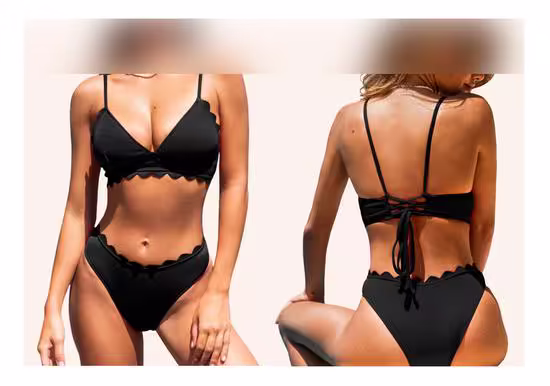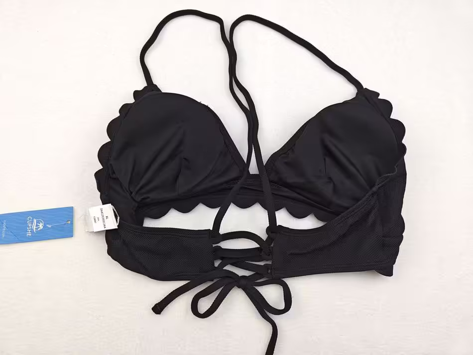 Article Neuf non porté protection culotte intact➡️ (PR-741) Maillot de bain bikini avec bord coquillage, deux pièces, noir, laçage dans le dos, Marque : CUPSHE, 92 % polyester et 8 % élasthanne , taille : XL