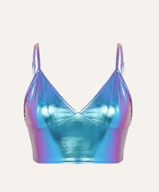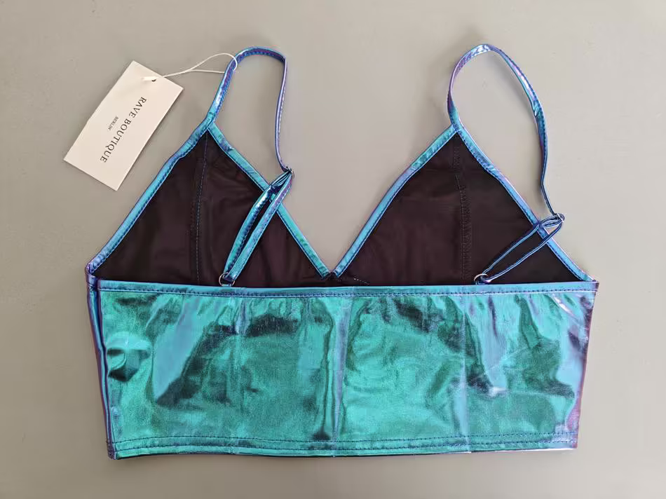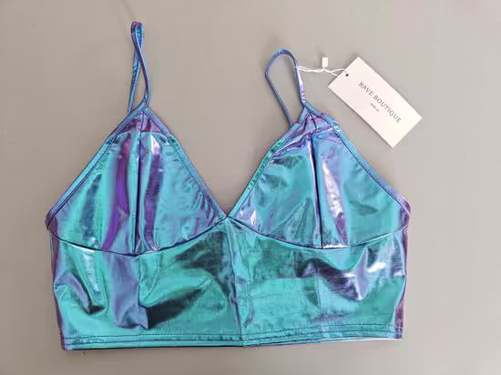 Article Neuf ➡️ (PR-798) Crop Top aspect métallisé bleu, marque : rave-boutique, taille M, 80 % polyester, 15 % coton, 5 % spandex, , taille : M, dimensions : Largeur corps haut : 39 cm, Largueur corps bas: 35 cm, hauteur bas jusqu’à début bretelle 25,5 cm.