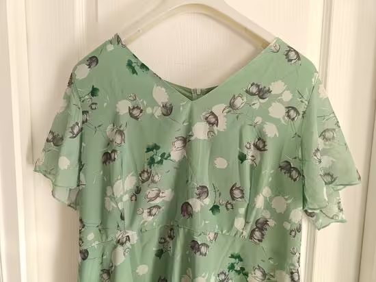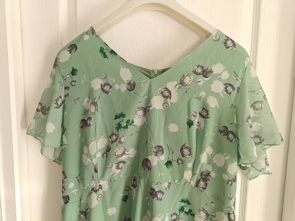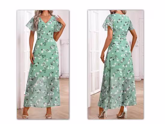 Article NEUF ➡️(pr-870) Robe longue verte col en V, 100 % polyester, marque : Gerrys Modehaus, taille 2XL, imprimé fleurs, doublure uni, longueur 150 cm, largeur 52 cm—————————-\