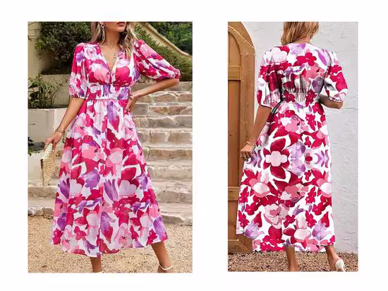 Article NEUF ➡️(pr-872) Robe longue rouge, col en V, 100 % polyester, marque : Gerrys Modehaus, taille 2XL, imprimé fleurs, ceinture élastique, longueur 120 cm—————————-\